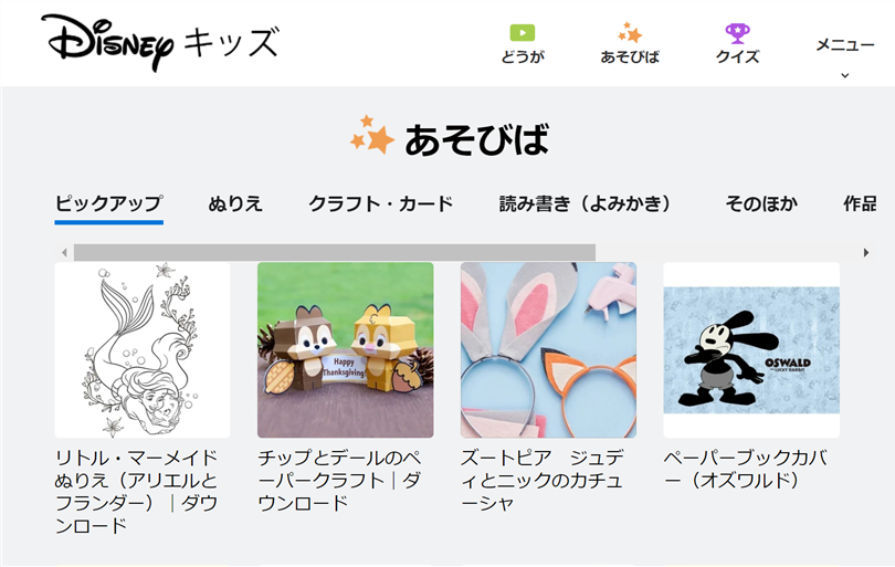 ディズニー公式サイトの中にコーナー一角に塗り絵とペーパークラフトがあります。